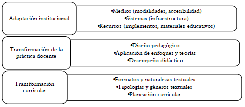 Por último, se analizó la categoría correspondiente a la transformación curricular, la cual está relacionada con la hipertextualidad. Esta se pudo aprovechar como recurso educativo, mostrando las cualidades del texto y así resignificar el aprendizaje en el aula de Lengua Castellana. Por otra parte, se mostraron las diferencias de estas naturalezas textuales en el campo virtual -"los textos digitales"- respecto a la presencialidad y se logró adaptar el currículo educativo de las distintos colegios y emplear diseños didácticos desde un enfoque comunicativo virtual. Miranda (2016) corrobora que las TIC son una herramienta útil de diseño curricular para el desarrollo de la producción textual y para la gestión del conocimiento; asimismo, Camargo (2018) afirma que la planeación curricular en un entorno virtual posibilita el desarrollo de las competencias de lectura y escritura desde el pensamiento crítico, debido al gran bagaje de contenido que se puede leer en los sitios web, además de estar a la vanguardia sobre los hechos sociales que viven sus Estados. Por otra parte, Bautista y Melo (2016) se concentran en las competencias comunicativas, las cuales están en constante desarrollo en las dinámicas educativas que logren reorientarse desde el aula, dado que todos los procesos de formación en lengua castellana deben conducir a la construcción de un discurso crítico.