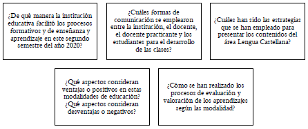 Consistió en el diseño de ítems para ser implementados con los informantes clave. Esta entrevista permitió recopilar información de gran relevancia, relacionada con los aspectos metodológicos y didácticos que permitieron evaluar el papel del docente practicante en el aula; además, proporcionó información valiosa sobre la percepción de los procesos educativos en el área de Lengua Castellana y, por consiguiente, permitió complementar los datos que arrojan las técnicas de recopilación de información y el diario de campo. Es necesario aclarar que algunos de los informantes fueron estudiantes, padres de familia y docentes que han orientado los procesos según su rol. En la Tabla 6 se enuncian algunos ítems abordados en la entrevista.