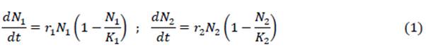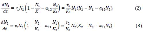 El término cuadrático representa la competencia intraespecífica, o sra, entre miembro de la misma especie. A medida que t →∞ œ, Ni →Ki , para Soda fabundanda inicial N0i >0. Ahora introdúzcase un efecto de competición interespecífica, en el que ceda especie causa un decrecimiento an la abundancia de la otra especie. Ya que las especia soon diferentes, el efecto de disminución puede- ser más fuerte o más débil. Dicho efecto se represrata en dos parámetros de competencia con αij: la "fuerza" del efecto de competencia de la especie j respecto de la especie i; α12 y α21, E l modelo queda: