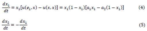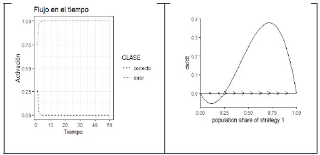 es decir que ambos deberían lugar la estrategía "correcto", "error" o la mixta. Supóngase ahora una población grande de individuos que son seleccionados aleatoriamente para jugar un juego simétrico de a dos. Cada individuo está programado para jugar las mismas estrategias mencionadas. Cada estrategía es jugada por una fracción de individuos de la población. Una estrategia se dice "evolutivamente estable" si es resistente a las perturbaciones. Osea, si otras estrategias mutantes que se introducen en la población eventualmente se entinguen porque nadie las juega. En el juego que nos ocupa las estrategia puras son estables y la mixta es inestable; Notar que si una estrategia es evolutivamente estable, entonces es un equilibrio dee Nash. Ambos conceptos suponen equilibrios estáticos. Pero supongamos ahora que cada individuo está programado para usar una estrategia pura, la cual replica a su descendencia. La dinámica del replicador muestra cómo la distribución de estrategias puras de la población cambia con el tiempo siguiendo un proceso de selección, y que dicha distribución converge a una estrategía evolutivamente estable ( punto fijo). Denótase x1 (t) a la fracción de individuos que juega la estrategia pura "error" en el tiempo t. En consecuencia, x2(t)= 1-x1(t) será la fracción de individuos que juega la estrategia pura "correcto" en el tiempo t. Por ende, el estado de la población en t estará dado por x(t) =(x1(t),1-x1(t)). El pago promedio ("fitness") de un individuo que usa la estrategia "error" es u(e1,x) el pago promedio de un individuo contra cualquier otro (promedio o "fitness" poblacional) es u (x,x). Las ecuaciones diferenciales para la dinámca del replicador para la matriz A son