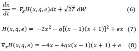 En el paradigma de Gradimt Symbolic Computation se postulan sistemas dinámicos estocásticos para tiempo y estados continuos. Se construyen gradualmente estructuras simbólicas discretas (atractores) a partir de un espacio de estados continuo. Considérese un modelo para una dimensión donde la variable "x" constituye un continuo Oe activación entre [-1,1].En los extremos "x" representa dos estados "puros" o atractores discretos: x= -1 es el símbolo "correcto" y x = 1 representa el símbolo "error". Los valores de x Є (-1,1 ) son estados "mezcla" entre ambos símbolos. Se desea que el sistema comience en un estado arbitrario y la activación vaya, hacia alguno de los estados "puros". Al inicio, la función de armonía H (x,q,e) tiene un único atractor que representa dicho estado "mezcla", intermedio entre "error" y "correcto". A medida que el parámetro q Є [0, 5] cambia, se produce una bifurcación y aparecen dos atractores estables. Por otro lado, el produce e Є [-1, 1] es el valor que sesga el flujo hacia alguno de los atractores. Se lo calcula mediante un mecanismo de similitud a los contextos ya especificados (ver material complementario). A medida que pasa el tiempo, el sistema escala el gradiente de la función de armonía 𝛻xH(x,q,e) para terminar cerca del pico de alguno de los dos atractores. sin embargo, si el ruido es grande, el sistema podría, por ejemplo, terminar en el atraOtor "error" aunque estuviera sesgado hacia el atractor "correcto". El modelo estocástico se muestra en (6); la función de armonía, en (7) y su gradiente, en (8). En (6) W es el proceso de Wiener, T es d nivel de ruido (que puede ser constante o decrecer con el tiempo de modo exponencial) y 𝛻x es el gradiente de la armonía total evaluada en valor de activación "x". tl primer término es el determinístico (drift) y el segundo es la parte estocástico.
