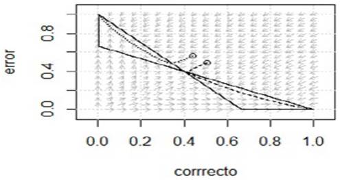 , el flujo escapa del punto inestable interno y se dirige al punto fijo estable de la estrategia pura de "error".