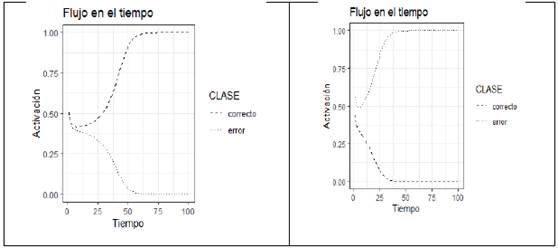 Las simulaciones que siguen tienen siempre dos atractores estables: "correcto" y "error". Para cada instancia se intenta recrear un sendero de "activación" en el "paisaje de eventos mentales" hasta que el sistema se acerque a uno de los atractores. Las variables especificadas en cada tipo de error se toman como un "contexto" que sesga el flujo de activación hacia uno de los atractores. Para lograr esto, se plantean diferentes mecanismos de similitud entre las variables de la instancia que se procesa y cada uno de los contextos que disminuyen el error. O sea, la idea fue combinar la lejanía a los contextos que favorecen el buen desempeño junto con los errores cometidos anteriormente, para sesgar el flujo de activación hacia uno de los dos atractores. A continuación, se detallan los modelos. El material complementario con el detalle técnico y el código de R empleado puede consultarse en github (https://github.com/pablomarafioti/PabloMarafioti/tree/master/Simulacion).
