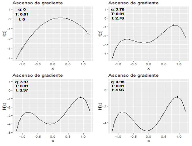 Ahora bien, supóngase e = 1; es decir que el sistema está sesgado hacia el atractor "error" (si e = 0 no h=y sesgo). La Figura 4 ilustra el comportamiento del sistema a medida que cambia el parámetro dinámico "q". Si q = 0 la "superficie" de armonía tiene la forma de una parábola con máximo global en x = ¼. Por lo tanto, dicho máximo es el único atractor y representa un estado "mezcla", intermedie" entre "error" y "correcto", con un poco de sesgo hacia el "error". Si se aumenta el valor de "q", se observará que aparecen dos máximos locales. Ha sucedido una bifurcación y se ha pasado de un atractor a sos atractores. A medida que "q" sigue aumentanto, el "valle" entre ambos máximos locales se hace más "profundo'. El sistema "escalará" el gradiente de armonía y eventualmente se aproximará x = ", el atractor del ""error". Si la cantidad de ruido T que se agrega a la parte determinística de la ecuación es pequeño, será difícil que haya valores que estén atraídos hacia el atractor "correcto" y superar "hacia atrás" el valle entre los máximos locales.