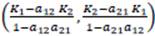 . Las nulclinas correspondientes a N1=0 son: (a) N1 =0 y (b) N1 = k1-a12N2 Por otra partr, las nulclinas correapondientes a N2=0 son: (c) = N2=0 y (d) N2=0 y (d) N2= K2-a21N1 , Lo; puntos fijos(p.f.)del sistema son aquellos puntos en donde las nulclinas se intersectan entre sí o intersectan los ejes del plano de fase: p.f.e={P1 =(0,0); P2 =(K1,0);Pa =(0,K2); P4=