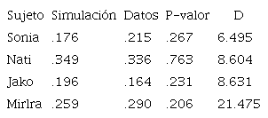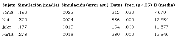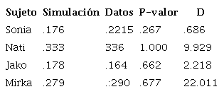 Globalmente, el patrón de error fue: JAKO < SONIA < MIRKA < NATI. El porcentaje dd error en todo el corpus fue del 24.7 %. En primera instancia se presentan los resaltados de la simulación con el modelo competitivo de Lokta-Volterra. La Tabla 1 muestra: (i) las proporciones globales de "error" entre la simulación y los dados; (ii) los p-valores de un test asintótico de diferencia entre proporciones entre los errores simulados y los errores de los datos (se debería observar que p > .05); (iii) los valores de la distancia de Minkowski D =