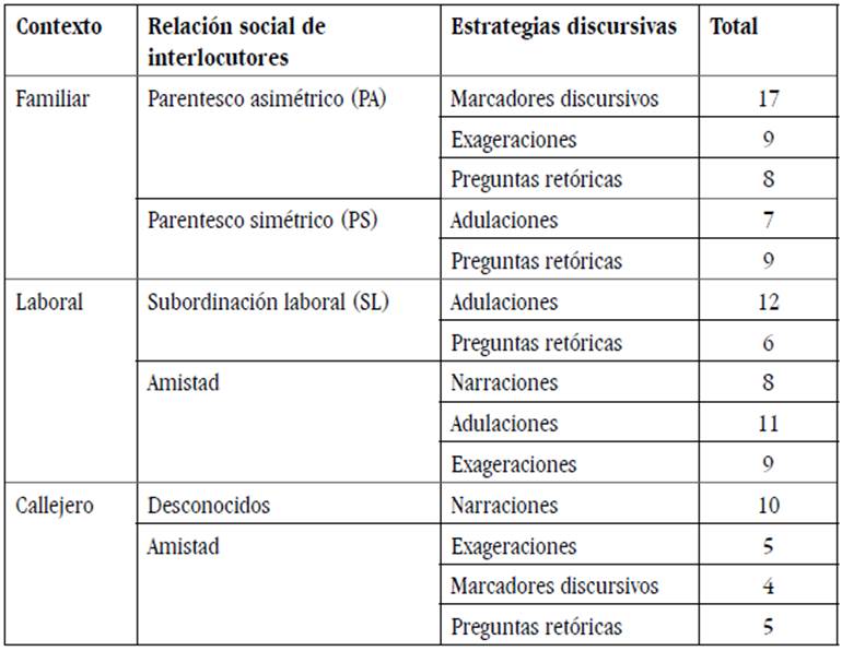 En los 120 actos de habla exhortativos o directivos se encontraron como mecanismos de atenuación y de intensificación el uso de marcadores discursivos, el uso de preguntas retóricas, narraciones, exageraciones y adulaciones. En la tabla siguiente se presenta la distribución por contexto y relación social entre interlocutores: