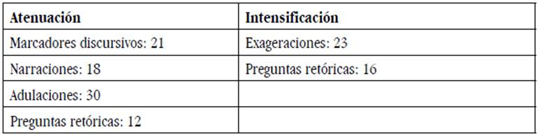 Los resultados indican que en Pereira la atenuación en los mandatos y las peticiones se expresa a través de unidades que actúan como marcadores discursivos, tales como digo yo y ustedes verán, del uso de narraciones incrustadas entre el núcleo y el mitigador del acto de habla, y de adulaciones; mientras que la intensificación se marca con exageraciones. Además, se evidencia que las preguntas retóricas pueden servir tanto para atenuar como intensificar la fuerza ilocutiva del acto exhortativo. En la Tabla 3 se presenta la relación de cada estrategia con la función atenuadora e intensificadora: