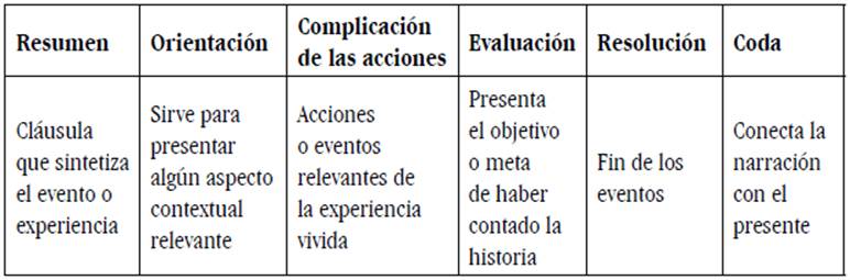 La narración es considerada por Labov como un "método que recapitula experiencias pasadas mediante la correspondencia de una secuencia verbal de cláusulas con una secuencia de eventos que ocurrieron de verdad" (Labov, 1972, p. 359). En la investigación sociolingüística la narración tiene dos funciones: referencial, que le permite al narrador informar al oyente sobre un evento o experiencia pasada, y evaluativa, en la que el hablante presenta su punto de vista frente a lo ocurrido y evalúa qué tan significativa es la experiencia.