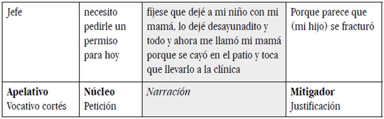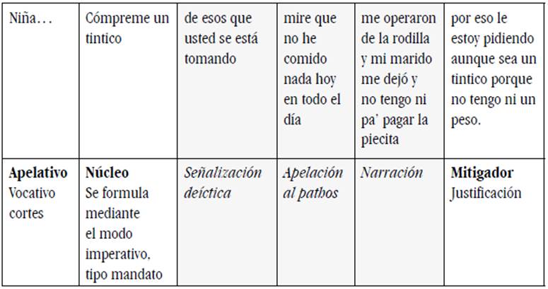 Como se observa en la Tabla 5, después del núcleo se inserta una señalización que alude al contexto físico, una construcción retórica cuyo objetivo es afectar el pathos del destinatario y que atenúa el requerimiento imperativo; además, aparece una breve narración cargada de acciones, cuya coda, en términos de Labov (1972), permite conectar la narración con el presente y justificar la petición de comprar un tinto.