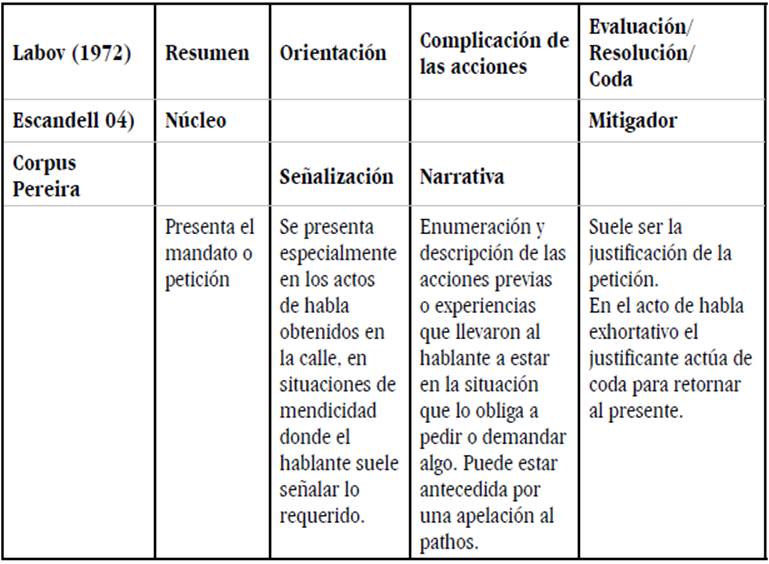 Dado que las narraciones analizadas por Labov se obtuvieron mediante entrevistas, ampliamos el punto de vista a partir de las interacciones reales y de los actos de habla exhortativos analizados en el habla de Pereira con dos casos prototípicos: