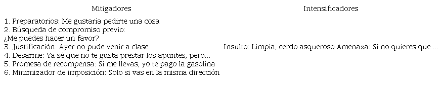Entre los apoyos o supportive moves,Escandell (2004) señala para el español los siguientes mitigadores e intensificadores:
