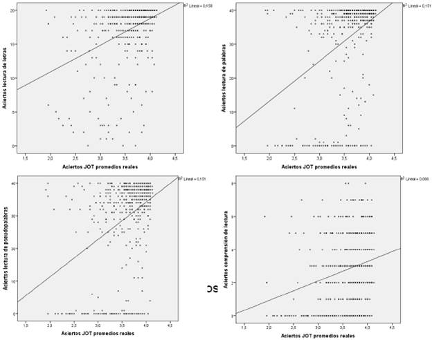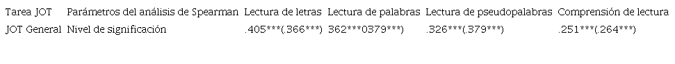 Cuando se analizó el procesamiento temporal de forma general, a través de los aciertos de todos los niños y niñas en todas las tareas de juicio de orden temporal (JOT general) -es decir, sin diferenciar modalidades y tipos de estímulos- se encontró correlación significativa entre todos los aciertos de las tareas de juicio de orden temporal general y los aciertos de las tareas de lectura de Prolec-R y con la prueba de comprensión de lectura ENI (Tabla 3).