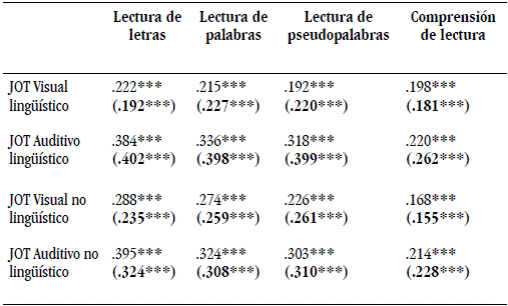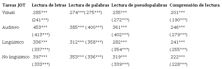 Por otra parte, en cada tarea de juicio de orden temporal en cada modalidad y tipo de estímulo se observó que el juicio de orden temporal visual lingüístico en 1.° tuvo correlación con la lectura de palabras y pseudopalabras. El juicio de orden temporal (JOT) auditivo lingüístico en 1.° tuvo correlaciones con todas las tareas de lectura, en 4.° con la tarea de lectura de letras, palabras, pseudopalabras y no con la comprensión de lectura. El JOT visual no lingüístico en 1.° con todas las tareas de lectura y en 5.° con lectura de pseudopalabras. El JOT auditivo no lingüístico en 1.° correlacionó significativamente con todas las tareas de lectura y en 4.° con lectura de letras y pseudopalabras (Tabla 11).