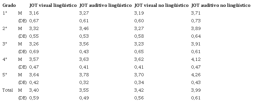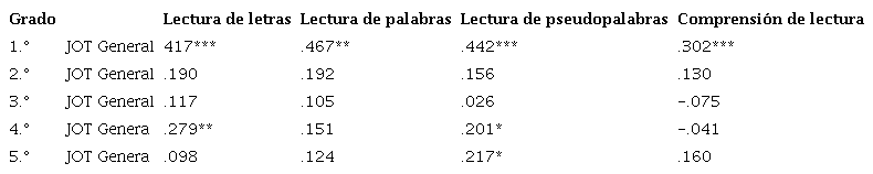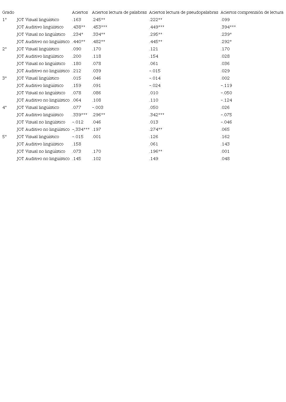 En primer lugar, era preciso tener un panorama general del procesamiento temporal y la lectura; por tal razón, se observó la correlación entre juicio de orden temporal general (todos los aciertos de las tareas de juicio de orden temporal computados, sin diferenciar modalidad y tipo de estímulo) y las tareas de lectura de letras, palabras, pseudopalabras y comprensión de lectura, en todos los niños y por cada grado escolar (1 vs. 2 vs. 3 vs. 4 vs. 5). En segundo lugar, era fundamental observar la relación específica entre cada modalidad y tipo de estímulo de juicio de orden temporal (JOT) con las tareas de lectura. En consecuencia, se estudió la correlación entre JOT visual, JOT auditivo, JOT lingüístico y JOT no lingüístico con las tareas de lectura descritas, en todos los niños y por cada grado escolar (1 vs. 2 vs. 3 vs. 4 vs. 5).