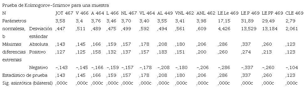 Antes de realizar los análisis, se llevó a cabo el test de normalidad Kolmogrov-Smirnov, dado que el tamaño de la muestra es superior a 50. El test reveló que los datos no presentan una distribución normal (ver Tabla 2); en este sentido, podemos indicar que existe un 0.0 % de riesgo de cometer error tipo 1. De esta manera, para evaluar las relaciones entre las variables debemos usar el coeficiente de correlación de Spearman. El grado de correlación oscila entre -1 hasta +1, cuanto más cerca esté el valor del coeficiente de correlación de Spearman a 1, más fuerte será esta. Además, se establece un nivel de significancia alfa igual o inferior a 0.05 en todos los casos de contraste. Elegir el análisis estadístico de Spearman en lugar de Pearson para correlaciones tiene el propósito de incluir valores extremos y se justifica por la sospecha de que los datos puedan no seguir una distribución normal o cuando se desean mitigar los efectos de valores atípicos en la relación entre las variables. Spearman se basa en clasificar los datos en lugar de depender de supuestos de normalidad, lo que lo hace más robusto frente a valores extremos y datos no lineales. Esta elección ayuda a obtener resultados más confiables y representativos cuando los valores extremos pueden influir significativamente en los resultados. Aparte de lo anterior, se controló la influencia que el género puede tener sobre los datos generales usando la correlación parcial, así se identifica hasta qué punto la diferencia de sexo modula el rendimiento en las tareas de lectura y comprensión.