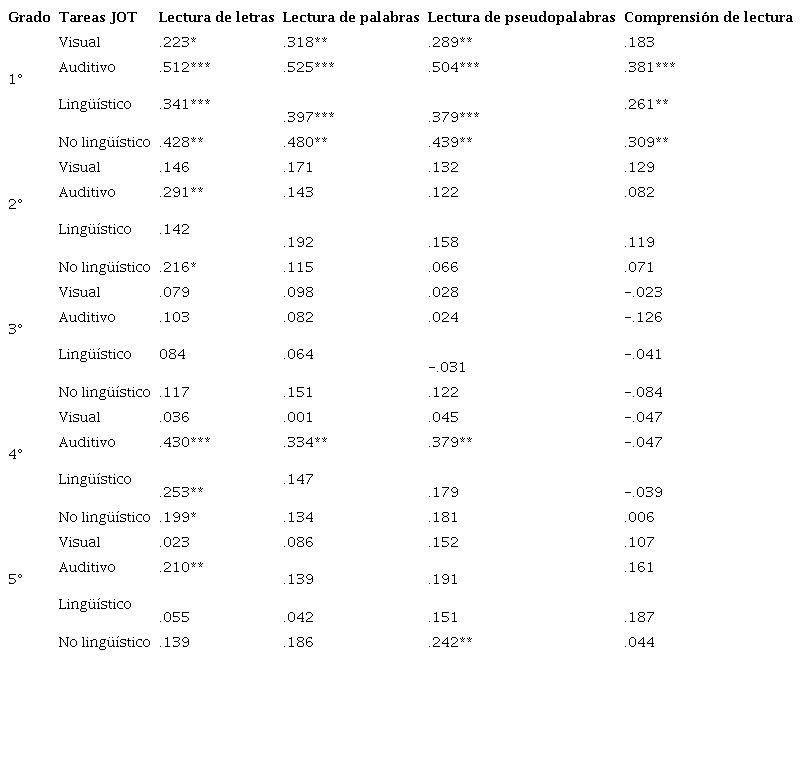 Al analizar las correlaciones entre cada tarea de juicio de orden temporal y cada tarea de lectura en cada grado, se observó que en los grados 1.°, 2.°, 4.° y 5.° se presentaron correlaciones significativas entre las tareas de procesamiento temporal y las tareas de lectura; no obstante, en cada uno de estos grados se observaron particularidades: mientras que en 1.° se observó una correlación significativa en la mayoría de las tareas de juicio de orden temporal (JOT) con las de lectura, a excepción de la JOT visual y la comprensión de lectura, que no se correlacionaron significativamente; en 2.° hubo correlación entre las tareas de JOT auditivo y no lingüístico con la lectura de letras; en 4.° todas las de JOT auditivo correlacionaron con todas las tareas de lectura, y las de JOT lingüístico y no lingüístico correlacionaron con la lectura de letras; y en 5.° las tareas de JOT auditivo correlacionaron con la lectura de letras y el JOT no lingüístico con la lectura de pseudopalabras (Tabla 8).