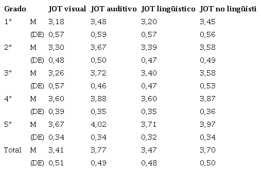 Por último, al observar las modalidades desde la perspectiva de los tipos de estímulos, también se observa el incremento de aciertos en relación con el aumento del grado escolar (Tabla 12).