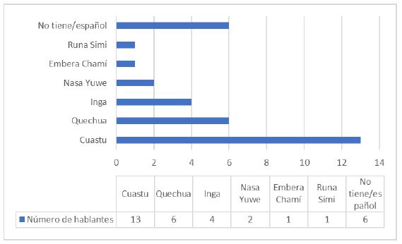 En esta subcategoría se compila la información relacionada con las lenguas indígenas usadas por los participantes del proyecto en la universidad, esto es, el nivel de suficiencia y los escenarios de uso, que sirven para un diagnóstico base de la información lingüística de los estudiantes. Los resultados muestran que así como existe una diversidad en cuanto a los pueblos representados, también hay una diversidad lingüística que hace parte de su cultura. Las lenguas representadas son las siguientes en orden de número de hablantes: el cuastu, quechua y runa simi, del pueblo de los pastos situados en los departamentos de Cauca y Nariño; el inga del pueblo de los ingas asentados en los departamentos de Nariño, Caquetá, Putumayo y en parte del Cauca; el nasa yuwe del pueblo nasa ubicado principalmente en los departamentos de Huila y Cauca; y el embera chamí, hablado por el pueblo que lleva el mismo nombre, se sitúa en los departamentos de Risaralda, Chocó, Caldas y Antioquia; estas, y la cantidad de estudiantes que las representan, se detallan en la siguiente figura: