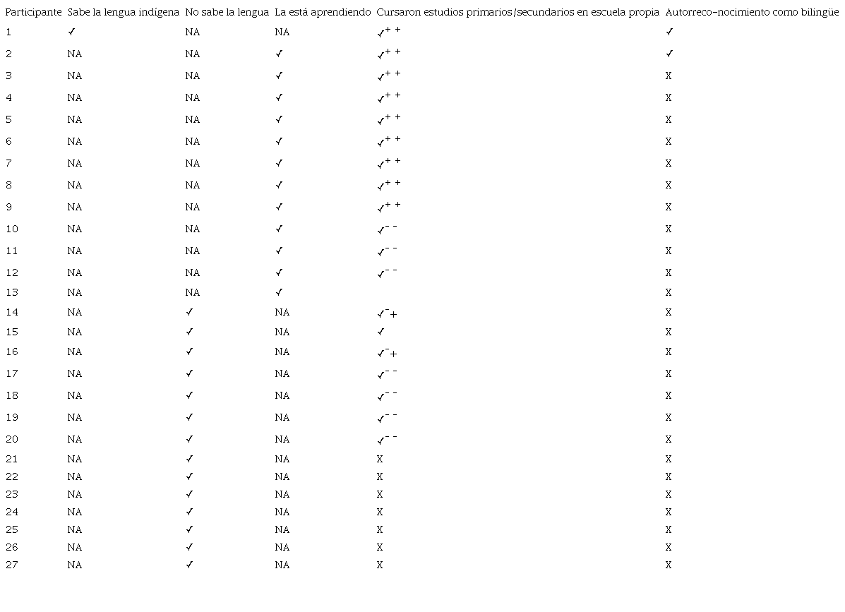 Del grupo de 14 participantes que reportan no saber la lengua indígena de su pueblo, los resultados indican que 3 de los participantes sí asistieron a escuela propia y que, aunque no se les enseñó la lengua indígena como tal, sí se trataron temas de identidad y cultura (en la Tabla 1 se representa como ✓ - +). 4 de los participantes de este grupo sí asistieron a escuela propia, pero no hubo procesos de aprendizaje de la lengua indígena ni de la cultura (en la Tabla 1 se representa como ✓ - -). Los últimos 7 participantes de este grupo no asistieron a una escuela propia. Se utilizó la sigla NA para los ítems que no aplican para un participante en concreto.