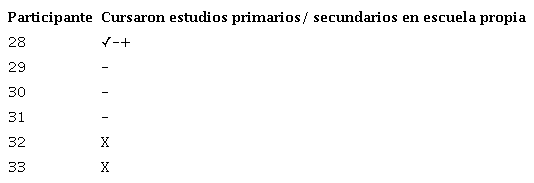 Para el grupo 2 (los 6 estudiantes que pertenecen a pueblos indígenas que han apropiado el español como su primera lengua y quienes no están en proceso de aprendizaje de esta) el análisis se refiere a la pregunta sobre donde realizaron sus estudios primarios y/o secundarios. Los resultados muestran que 1 de las participantes asistió a escuela propia donde no se enseñaba la lengua, pero sí se fomentaba la cultura indígena (en la Tabla 2 se representa como ✓-+); 3 de los participantes sí asistieron a escuela propia, pero no se les enseñó la cultura indígena ni tampoco la lengua (en la Tabla 2 se representa como ✓--); y 2 no asistieron a escuela propia.