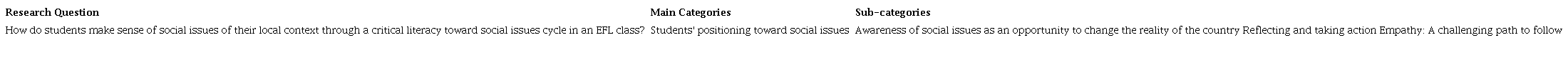 The main category that emerged after analyzing the data gathered through the different instruments was students' positioning toward social issues, which includes some sub-categories: Awareness of social issues as an opportunity to change the reality of the country, reflecting and taking action, and empathy: a challenging path to follow (Table 1).
