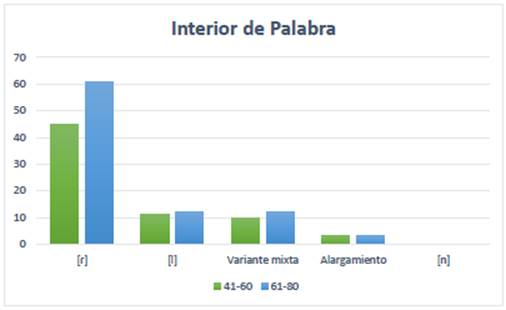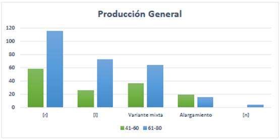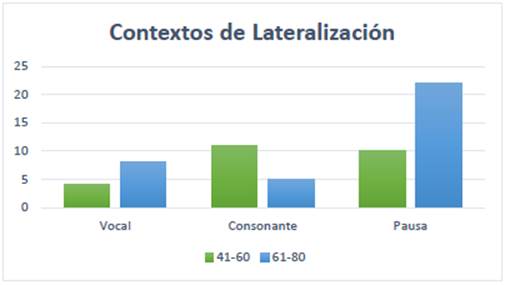 Por tanto, vemos que la producción de /ɾ/ es completamente opuesta en el contexto "seguida de consonante" en los dos grupos de edad analizados: es el contexto en el que más lateralizan los de mediana edad y el contexto en el que menos lateralizan los más mayores. Además, existe otro gran contraste entre los dos grupos en cuanto al número de lateralizaciones producidas en los diferentes contextos: en el grupo de entre 61 y 80 parece haber mayor diferencia en la lateralización entre contextos, mientras que en el grupo de entre 41 y 60 el número de producciones lateralizadas en cada contexto es más cercano.