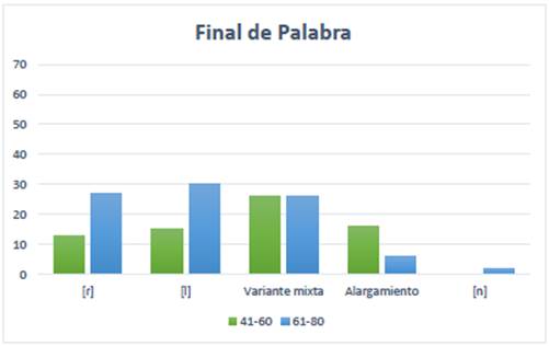 Por el contrario, con respecto a los alófonos de /ɾ/ en posición final de palabra, sí se encuentra una diferencia más marcada en la producción según la edad. El alófono que más producen las participantes más jóvenes en posición final es la variante mixta, seguida de un alargamiento de la vocal que precede a la /ɾ/ y de [1] (Figura 11). En el caso de los participantes más mayores, el alófono más producido es [1], seguido de [r], variante mixta y alargamiento (Figura 11). El alófono que se produce menos en el caso del grupo de edad de entre 41 y 60 es [r], mientras que el alófono menos producido por los participantes de entre 61 y 80 es [n].