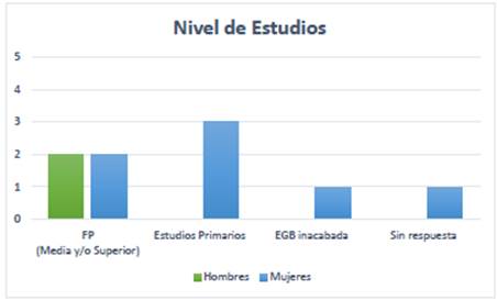 Con respecto a su nivel de educación, cuatro de los participantes tienen estudios de Formación Profesional (FP)7, tres tienen estudios primarios y uno no terminei la Educación General Básica (EGB). Un participante no respondió a esa parte de la encuesta, así que no se sabe cuál es su nivel de estudios: