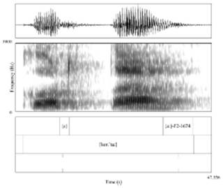 Para analizar la producción de la /ɾ/ por parte de los nueve participantes, se marcan e identifican en el software Praat todas las producciones de la vibrante simple de cada participante tanto en las oraciones como en las fotos. Mientras se lleva a cabo esta identificación y codificación de las /ɾ/, se tienen que eliminar 6 tokens de las oraciones y 18 tokens de las fotos 8. Por tanto, una vez hecho el análisis con Praat, se obtiene un total de 318 (237+81) tokens 9, que se etiquetan de la siguiente manera: "palabra-alófono-F2-caracteristicas del hablante-sorda/sonora". En la Figura 3 se puede ver un ejemplo: