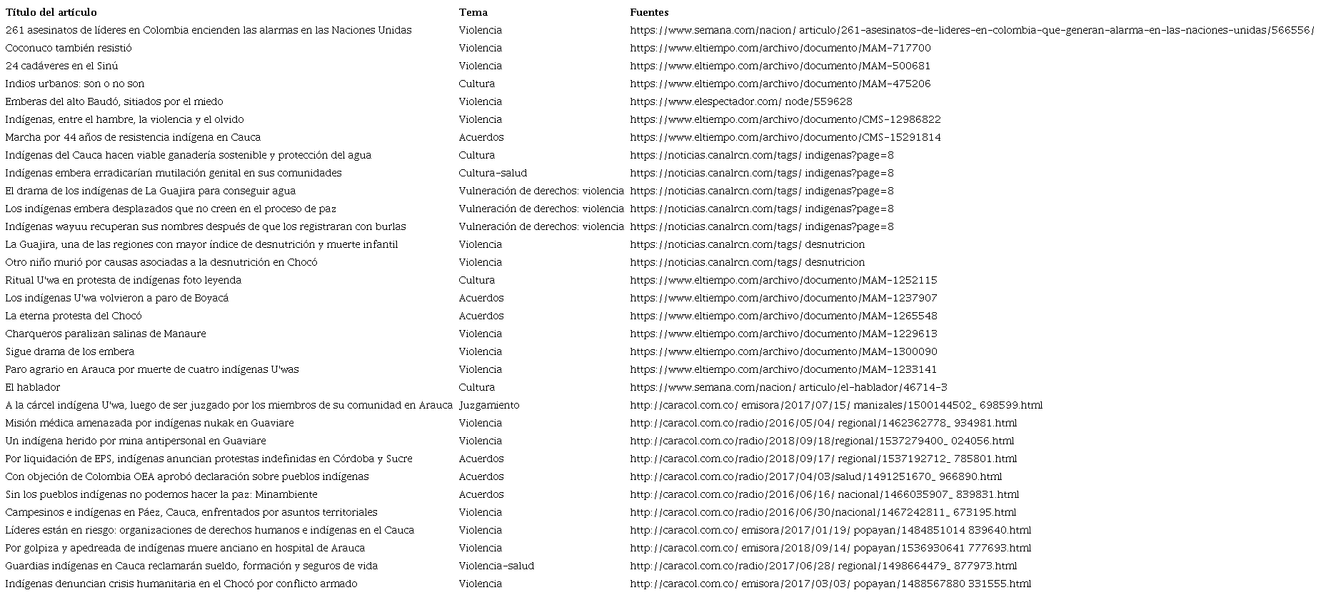 Para lograr este objetivo se seleccionaron noticias de los diarios El Tiempo y El Espectador, así como de los noticieros digitales Noticias Caracol y Noticias RCN, entre otros medios de difusión digital. El corpus de análisis se adquirió de los artículos publicados en estos períodos, los cuales fueron escogidos por los hechos narrados y el análisis de los diversos medios sobre los indígenas (Tabla 1). El análisis se hizo a través de una clasificación cronológica en la que se subordinaron las noticias por su contenido, por el medio de publicación y por la fecha de esta. Cuando una noticia incluía más de un contenido, se examinaba cada uno de ellos, seleccionando los más adecuados según el que más profundizara sobre los problemas indígenas actuales.