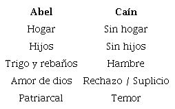 El pasaje de la Biblia nos dice además que Abel era pastor y Caín agricultor, lo cual evidencia así la oposición ya citada, que también existe entre las dos tradicionales y distintivas actividades de la tribu: el pastoreo -representado por la vida nómada- y el cultivo -caracterizado por ser una labor sedentaria-. La primera, llevada a cabo por Abel, es bendecida por Dios, mientras que la segunda no lo es. La rebelión de Caín, fomentada por los celos o el sentido de injusticia2, lo lleva a matar a su hermano. Ante esto, el Todopoderoso maldice al primogénito; maldición que, en cierta medida, le garantiza también la inmortalidad, pues 'si alguien matare a Caín, será siete veces vengado' (4-14).