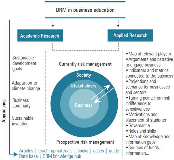 Multiple attempts were made to reach out to the business education community, looking for windows of opportunity to embrace the topic of DRM within their academic and extension programs. After careful examination, seven themes related to innovative approaches and cutting edge DRM content were identified: (1) Strategic Investment and Financial Decisions; (2) Generating Business Value; (3) Sustainable Management; (4) Business Ethics and Social Responsibility; (5) Business Continuity Planning; (6) Disaster Risk Metrics; and (7) Risk Transfer.