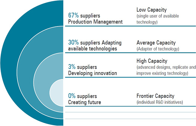 Thus, as depicted in figure N°1, most local suppliers operate in a context of production management and adaptation of available technologies. While only 3% of firms show advanced conditions that facilitate the development of innovation processing and/or the advanced design to improve existing technology. Nevertheless, there are no local suppliers whose activity is focused on expanding the knowledge frontier in mining, as seen in the figure below. In sum, the vast majority of Chilean mining suppliers tend to be less capable of developing new knowledge or innovations in their overall sector that will have positive effects on the mining industry and its value chain.