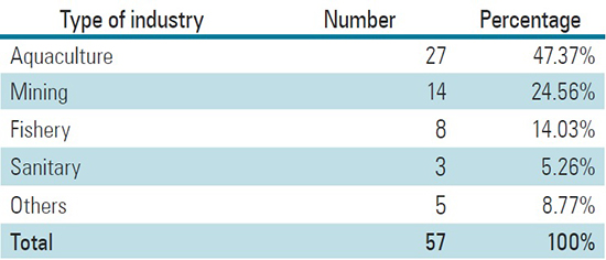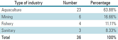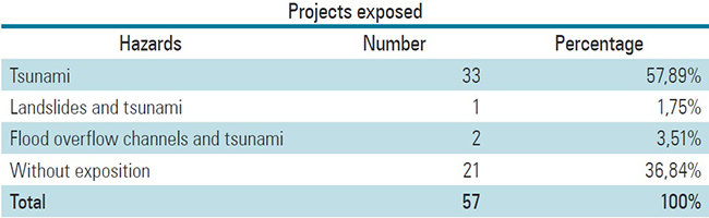 On one hand, more than a half of investment projects are only located in areas prone to the risk of tsunami, 1.75% are in areas prone to the threat of landslides and tsunami and 3.51% in areas with potential flood threat by overflow channels and tsunami. On the other hand, as shown in table number 3, taking into account investment projects located in areas of exposure, productive activities of the aquaculture industry are more common as potentially affected, with 63.88%, followed by mining reaching 16.66%. Fisheries and sanitary industries represent a small percentage.