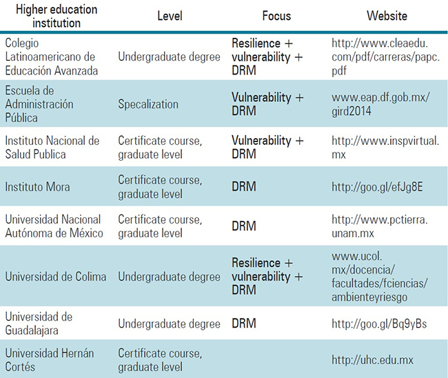 In higher education, different Mexican institutions include disaster management as part of their program offerings, either as undergraduate degrees or as certificate courses focusing on different aspects of disaster risk management and prevention. As of date, the following are available as shown in Table 1 below: