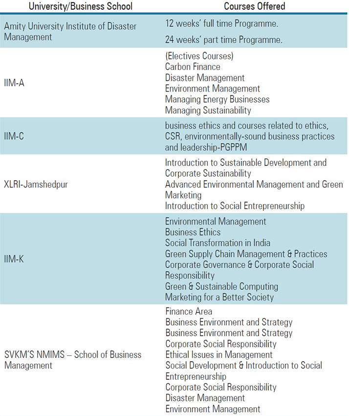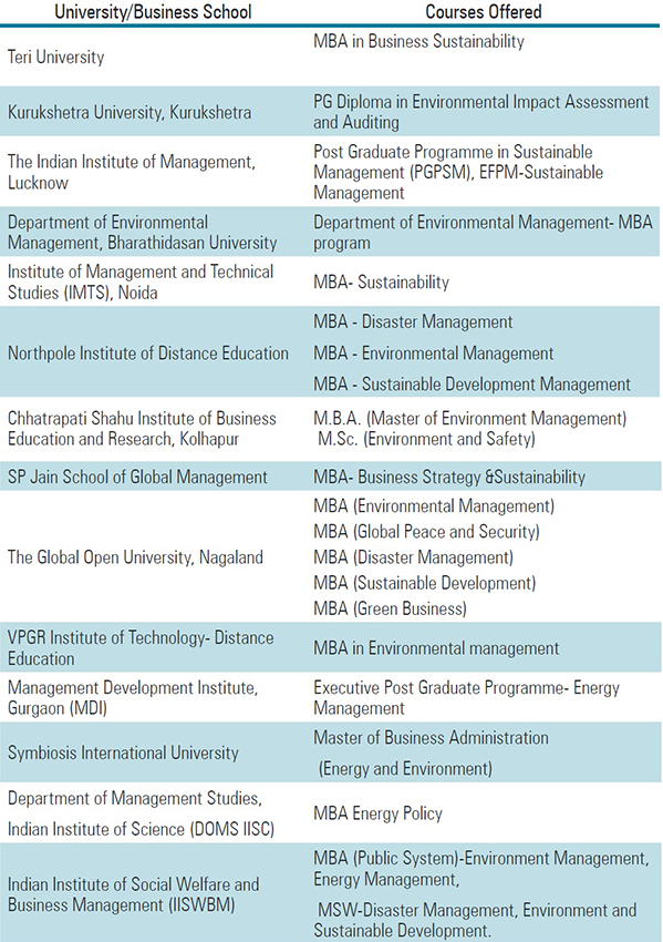 The MBA in Business Sustainability at the TERI University covers a variety of courses, including Principles and Concepts of Sustainability, Climate Change and Development, Sustainability Reporting and CSR, Sustainable Business Strategy, Business and Society and Environmental Economics. Core sustainability courses taught in this are given in Table 4: