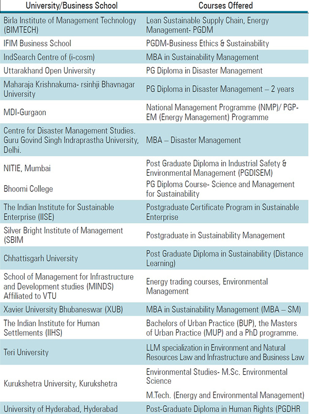 The content and pedagogy of sustainability courses also vary greatly between business schools. The most common approach has been to introduce standalone courses in sustainability or allied areas such as corporate governance, ethics, corporate social responsibility, green operations etc., Much of these initiatives have been individual faculty driven. A second approach now being adopted by a few schools is to introduce compulsory core courses as a part of the first year core curriculum as in the case of schools like IIM Ahmedabad, Xavier School of Management Jamshedpur, Xavier Institute of Management Bhubaneshwar, IIM Lucknow and others. In many of these instances multiple courses on environment are offered. However, in most instances the courses are strongly driven by faculty interests and their future depends on continued faculty interest, something that is diftcult to sustain, given the wide variations in student interest and institutional support. Even where environmental courses are offered, these are currently done in a very disjointed manner and not integrated with the functional areas. Also in the absence of a concerted effort and lack of adequate focus by the business schools themselves the impact of these pioneering efforts is limited. A third approach has been to introduce masters level programmes in sustainable business management as given in Table 1. An early attempt at starting a sustainability programme was from Symbiosis University in 2008 by way of an integrated Energy and Environment program. The most recent have been the launch of Post Graduate Programmes in sustainability by two premier institutions: Xavier University and the Indian Institute of Management Lucknow (IIML). However most of these programmes have remained small and have not been scaled up.