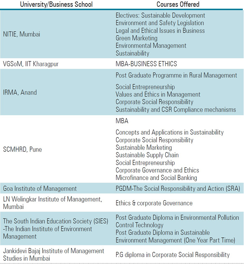A survey on Corporate Responsibility education in India among top ranked 104 schools by Partners in Change concluded that while corporate responsibility education had made some progress, significant steps were further needed (Partners in Change, 2007). A second study on the status of ethics, corporate governance and environment education concluded that of the 107 schools surveyed ''ethics was offered by 64.49%, corporate governance by 31.78%, CSR by 10.28% and environment and sustainability by 14.02% of the business schools surveyed (Srinivasan, Srinivasan ∓ Anand, 2012).