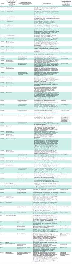 Despite the focus of this third internationalization stage was to make international acquisitions of production platforms, interviewees and documents explained that since 2004, Grupo Nutresa continued expanding its distribution operations and making national acquisitions to consolidate its home market position and start a new ice cream business unit. Regarding its international acquisitions of production platforms, documents and archival data reported a long list since 2004. Interviewees agreed that the main criteria to guide international acquisitions was that the acquired firm had good management, distribution, and positioned brands. The international acquisitions of production platforms were: biscuits and chocolates plants from Nestlé in Costa Rica in 2004; Galletas Pozuelo in Costa Rica for the biscuits business unit and Blue Ribbon in Panama for the cold cuts business unit in 2006; Good Foods in Peru with participation in the chocolates, biscuits, and sugar candy businesses in 2007; Ernesto Berard in Panama to complement the cold cuts business unit in 2008; Nutresa in Mexico for the chocolates business unit in 2009; Fehr Holdings in the United States to grow the biscuits business unit in 2010; Helados Bon, an ice cream firm with customer stores in Dominican Republic in 2011; Helados Pops, an ice cream firm with customer stores in Costa Rica in 2012; Dan Kaffe to grow the coffee business unit in Malaysia in 2012 -this is when Grupo Nutresa became a Global Latina by transcending its region to consolidate foreign direct investments in two other continents besides Latin America: North America with Fehr Holdings and Asia with Dan Kaffe- ; and Tresmontes Luchetti leader in the food industry in Chile with various business lines in 2013. This extensive list of international acquisitions was cleverly summarized by the CEO as: