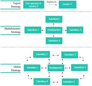 Global strategy. This corporate-level international strategy is followed by born globals1 or mature multinationals that become aware of the opportunities to be gained from integrating and creating a single strategy on a global scale (Frynas and Mellahi, 2011). A global strategy involves one strategy for the entire network of operations encompassing many countries simultaneously and leveraging synergies across countries. In contrast to the multidomestic strategy, a global strategy involves the standardization of products across markets (Buckley, 2009; Li, 2005; Temple and Walgenbach, 2007). Therefore, a global strategy is centralized and controlled by headquarters. The subsidiaries operating in each country are considered interdependent and headquarters attempts to achieve integration across them (Moon and Kim, 2009). The purpose of this strategy is to offer standardized products across markets, with competitive strategy being dictated by headquarters (see Figure 1).