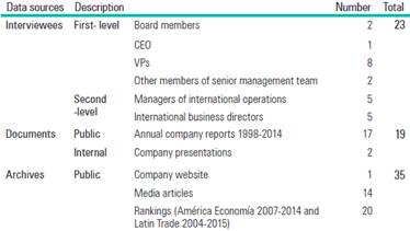 To build Grupo Nutresa's case, a chronology was created through the triangulation of documents, archival data, and interviews (Eisenhardt and Santos, 2009). Several hundred pages of documents, included Grupo Nutresa's public annual company reports and company presentations about internationalization. In addition, archival data referred to Grupo Nutresa's website, media articles about its international expansion, and rankings from América Economía between 2007-2014 and Latin Trade between 2004-2015. Cross-matching documents, archival data, and interviews during the analysis stage enhanced validity and reliability through the use of multiple sources of information that provided completeness to Grupo Nutresa's case (see Table 2). Once a draft of Grupo Nutresa's case chronology was built, it was crosschecked with key informants to enhance its validity and reliability. Their comments and suggestions were included in a final version of Grupo Nutresa's case chronology that comprised: dates, corporate-level decisions in Colombia, corporatelevel internationalization decisions, and the international scope of production and distribution operations. Corporate-level decisions in Colombia were included to better explain the context and sequence of Grupo Nutresa's corporate-level internationalization decisions over time. Grupo Nutresa's case chronology started in 1916 to understand this firm's foundation and antecedents. However, international activity only initiated until the 1960s with opportunistic exports and developed more strongly since the 1990s. The appendix in this article shows a summarized extract from Grupo Nutresa's case chronology (see Appendix).