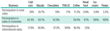 Grupo Nutresa is ranked as the leading processed food firm in Colombia and one of the most important players in the sector in Latin America. It has emerged into the global arena by international operations transcending its home region to reach North America, Asia, Europe, Africa, and Oceania. It has nearly 44,000 employees and operates through eight business units: biscuits, chocolates, coffee, cold cuts, ice cream, pasta, retail food, and Tresmontes Lucchetti -TMLUC, a firm acquired in Chile that offers multiple products and operates as a business unit-. Between 1998 and 2015, its international sales increased from USD $10.9 million to USD $ 1.1 billion, accounting for approximately 4% of total sales in 1998 to 38.6% of total sales -$ 2.9 billion- in 2015. The participation of each business unit in sales during 2015 is detailed in Table 3, starting with the business unit with the highest participation in total sales. Between 1998 and 2015, Grupo Nutresa's employees in foreign operations grew from 400 to 12,600 while its profits multiplied by 11. Grupo Nutresa claims that these results have been achieved due to its differentiated business model based on its people: talented, innovative, committed, and responsible individuals who contribute to sustainable development. Its brands: leaders, recognized, and beloved are part of the daily life of consumers. These brands are supported in nutritious, reliable products, and a distribution network with differentiated offers by channels and segments that make the portfolio of products widely available throughout the firm's strategic region.