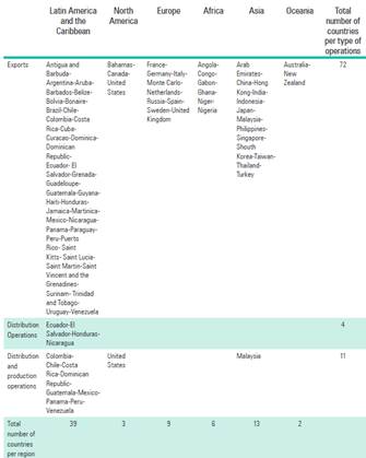 As a result of its internationalization process, in 2015, Grupo Nutresa owns production and/or distribution operations in 15 countries on three continents: Latin America, North America, and Asia. This Global Latina also exports its products to over 72 countries, located in the continents already mentioned where it owns operations, and in other continents, such as Europe, Africa, and Oceania (see Table 4 for Grupo Nutresa's scope of operations).