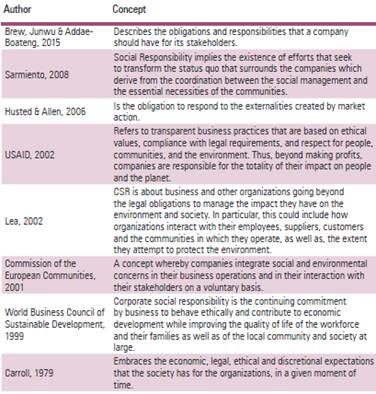 Nowadays, speaking about CSR in the business world is common (Husted & Allen, 2006). Likewise, it is contradictory that such a relevant and common term, is not described as a clear concept (El Ghoul, Ghedami & Kim, 2016; Brew, Junwu & Boateng, 2015; Dahlsrud, 2008). The first to define CSR was Bowen (1953), however Carroll (1979) was the first to offer a model that integrates different elements of the concept of CSR. From there, different concepts have emerged. The following are some concepts of CSR that have been identified in the literature: