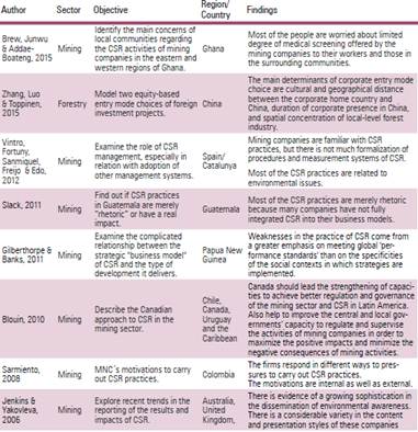 Table 3 shows several papers that analyze CSR in extractive companies. These mainly identify studies in emergent regions such as Latin America (Guatemala, Chile, Uruguay, the Caribbean and Papua New Guinea). Also, these studies have mainly focused in the mining sector, disregarding other sectors in the extractive industry.