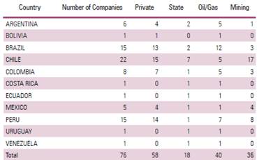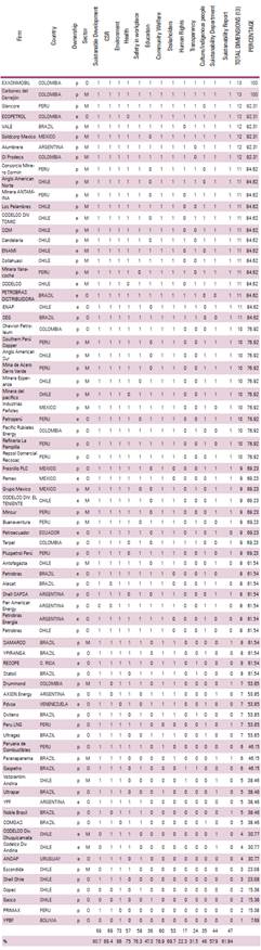 Also, it is important to point out that within the group, foreign companies as well as local Latin American companies were considered. Considering that independently of their origin, all the extractive industry companies, given their nature, cause an important impact in the environment where they operate. Hence, limiting the group of companies by their type of ownership would not make a full analysis possible.