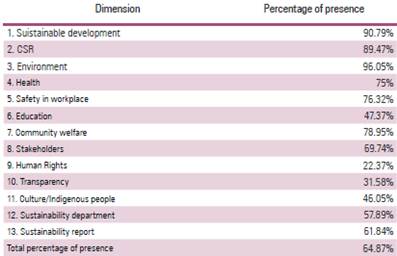 Table 5 shows the different dimensions of CSR and its percentage of presence (See methodology). It is observed that Environment (96.05%) and Sustainable Development (90.79%) are the most considered dimensions in the companies, in regards to CSR. On the other hand, the least considered are Human Rights (22.3%) and Transparency (31.58%).
