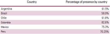 Table 6 shows the percentage of presence by country, which is the average of the percentages obtained by the companies of each country. It is worth mentioning that the countries which showed only one company, such as Bolivia, Costa Rica, Ecuador and Uruguay were eliminated, as it was considered that these would limit the analysis to an average of 100%.