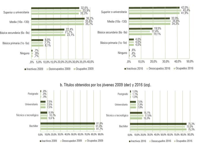 Respecto a los niveles de formación alcanzado por los jóvenes (Figura 1, parte (a)), se observa cómo la población desocupada alcanzó, en mayor proporción, el nivel superior mientras que la población inactiva alcanzó el nivel medio en el 2009. En relación a los títulos obtenidos (figura 1, parte (b)), se observa cómo los jóvenes alcanzan principalmente el nivel de bachiller en el que los jóvenes inactivos tienen una alta participación. A partir de estas cifras, se identifica un gran porcentaje de jóvenes que alcanzan niveles de escolaridad altos, pero no obtienen títulos educativos en dichos niveles.